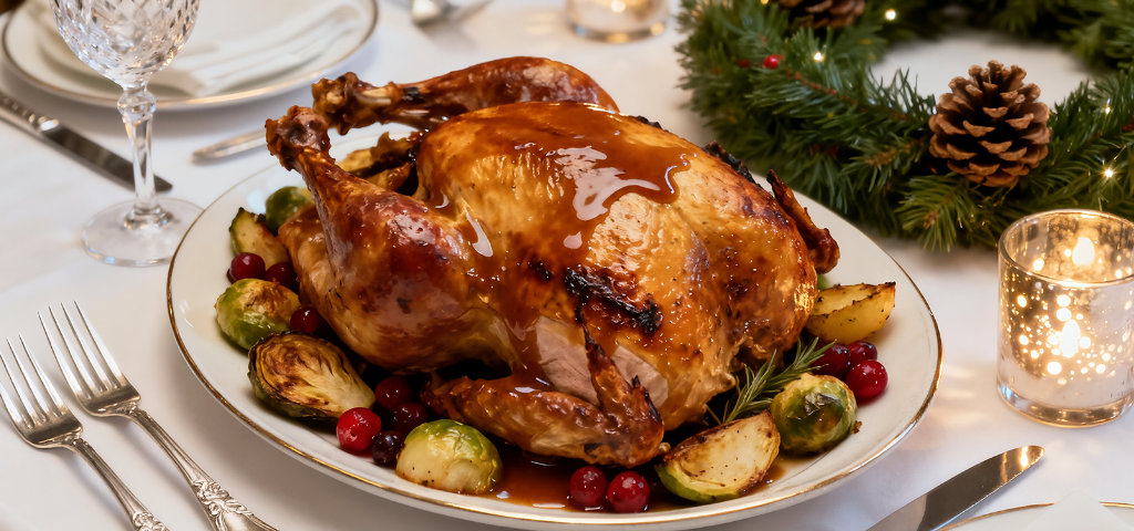 - Cocina el pavo 35–45 minutos, bañándolo con salsa cada 10–12 minutos para formar una capa dorada y brillante. Si la piel se dora muy rápido, cubre con papel aluminio y continúa el calor hasta que esté bien caliente en el centro.